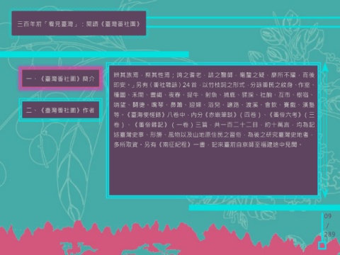 熟番之生活記事,立下筆記文學之範式。據他自言,本書是宦臺時「休沐
