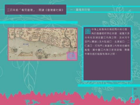 三百年前「看見臺灣」:閱讀《臺灣番社圖》 一、圖像與符號 圖 中海上船隻有的揚起兩片帆行進、 有的僅繪桅杆停在岸邊,船隻大多 分布在澎湖至臺江內海之間,淡水河干 豆門 ( 關渡 ) 及大肚溪口、北港溪口、二 仁溪口、打狗門 ( 高雄港 ) 內等地也繪有 船隻。圖中臺江內海已呈現淤積,需靠 牛車往返於船隻和海岸之間。 99 / 289