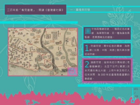 三百年前「看見臺灣」:閱讀《臺灣番社圖》 一、圖像與符號 圖 中有兩種線符號,一種是紅色的實 線,為軍隊防線,另一種為黃色黑 點線,是貫通南北的道路。 . 防線符號:圖中紅色的實線,為陸 1路 ( 北路、中路、南路 ) 營兵與水師 巡哨防線。 . 道路符號:這條南起沙馬岐頭 ( 恆 2春貓鼻頭 ),北至干豆門 ( 關渡 ) 淡 水河邊的南北大道,上有牛車及有行人 往來其間,為 300 年前臺灣島最重要的 聯絡道。 101 / 289
