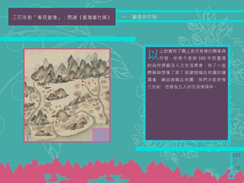 三百年前「看見臺灣」:閱讀《臺灣番社圖》 一、圖像與符號 以 上欣賞完了圖上各式各樣的圖象與 符號,你是不是對 300 年前臺灣 的自然景觀及人文生活景象,有了一些 瞭解與想像了呢 ? 感謝這幅古地圖的繪 圖者,藉由這幅古地圖,我們才能穿梭 三世紀,悠遊在古人的生活情境中。 103 / 289