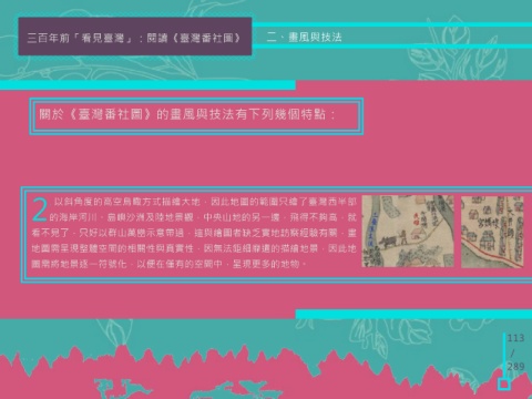 三百年前「看見臺灣」:閱讀《臺灣番社圖》 二、畫風與技法 關於《臺灣番社圖》的畫風與技法有下列幾個特點: . 以斜角度的高空鳥瞰方式描繪大地,因此地圖的範圍只繪了臺灣西半部 2的海岸河川、島嶼沙洲及陸地景觀,中央山地的另一邊,飛得不夠高,就 看不見了,只好以群山萬巒示意帶過,這與繪圖者缺乏實地訪察經驗有關,畫 地圖需呈現整體空間的相關性與真實性,因無法鉅細靡遺的描繪地景,因此地 圖需將地景逐一符號化,以便在僅有的空間中,呈現更多的地物。 113 / 289