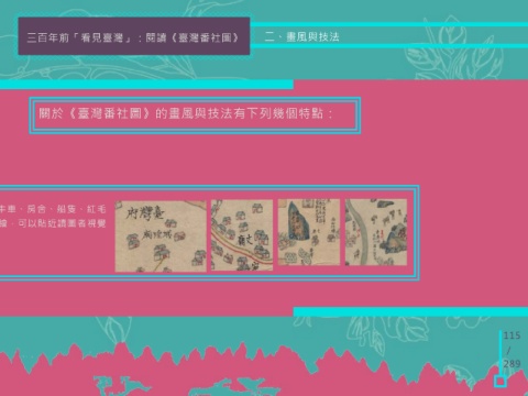 三百年前「看見臺灣」:閱讀《臺灣番社圖》 二、畫風與技法 關於《臺灣番社圖》的畫風與技法有下列幾個特點: . 以平視的角度描繪,圖中人物、動物、植物、牛車、房舍、船隻、紅毛 . 以平視略帶仰視的角度描繪遠山。 3 樓等內容,以平視或部分略帶俯視的角度加以描繪,可以貼近讀圖者視覺 4 整幅地圖以多視點構圖的方式呈現,不受單點透視學限制,有趣的呈現 效果。 300 年前繪圖者對臺灣自然及人文環境的圖像紀錄。 115 / 289