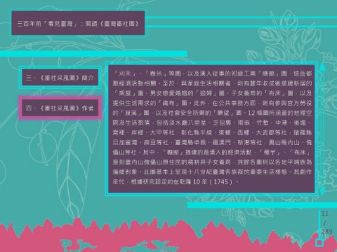 儡山等社。其中,「糖廍」描繪的是漢人的經濟活動,「種芋」、「布床」