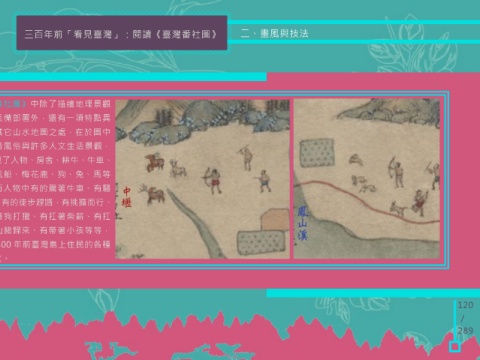 三百年前「看見臺灣」:閱讀《臺灣番社圖》 二、畫風與技法 《臺灣番社圖》中除了描繪地理景觀 及行政兵備部署外,還有一項特點異 於清代其它山水地圖之處,在於圖中 繪製漢番風俗與許多人文生活景觀, 畫中出現了人物、房舍、耕牛、牛車、 橋樑、帆船、梅花鹿、狗、兔、馬等 動物,而人物中有的駕著牛車、有驅 趕著牛、有的徒步趕路,有挑擔而行、 有的帶著狗打獵、有扛著柴薪、有扛 著狩獵山豬歸來、有帶著小孩等等, 呈現了 300 年前臺灣島上住民的各種 生活情狀。 120 / 289