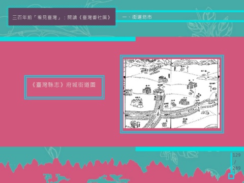 三百年前「看見臺灣」:閱讀《臺灣番社圖》 一、街道坊市 《臺灣縣志》府城街道圖 129 / 289