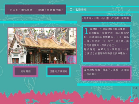 三百年前「看見臺灣」:閱讀《臺灣番社圖》 二、名勝壇廟 城的名勝壇廟包括城隍廟、娘媽宮、海會寺、文廟、山川臺、紅毛樓、嶽帝廟、社稷壇等 . 城隍廟:分府城隍廟和縣城隍廟。 1府城隍廟:在東安坊,順治皇帝定 制,府城隍廟與風雲雷雨、山川,共為 一壇。凡是府、州、縣守土官入境,要 先向城隍稟告,然後才赴任。 縣城隍廟:在鎮北坊,康熙五十一年 (1812)由臺灣縣知縣張宏捐俸建造。 臺南府城隍廟「爾來了」匾額,為府城 府城隍廟 現臺南府城隍廟 三大匾額之一。 134 / 289