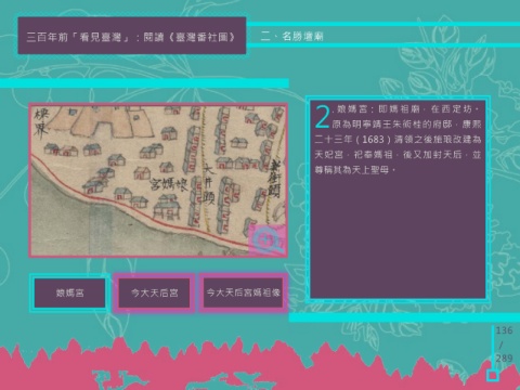 三百年前「看見臺灣」:閱讀《臺灣番社圖》 二、名勝壇廟 . 娘媽宮:即媽祖廟,在西定坊。 2原為明寧靖王朱術桂的府邸,康熙 二十三年(1683)清領之後施琅改建為 天妃宮,祀奉媽祖,後又加封天后,並 尊稱其為天上聖母。 娘媽宮 今大天后宮 今大天后宮媽祖像 136 / 289