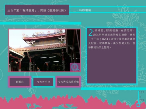 三百年前「看見臺灣」:閱讀《臺灣番社圖》 二、名勝壇廟 . 娘媽宮:即媽祖廟,在西定坊。 2原為明寧靖王朱術桂的府邸,康熙 二十三年(1683)清領之後施琅改建為 天妃宮,祀奉媽祖,後又加封天后,並 尊稱其為天上聖母。 娘媽宮 今大天后宮 今大天后宮媽祖像 137 / 289