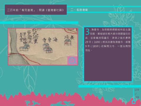 三百年前「看見臺灣」:閱讀《臺灣番社圖》 二、名勝壇廟 . 海會寺:為明鄭時期鄭經所設北園 3別館。鄭經過世前大部分時間居住於 此,並奉養其母董氏。清領之後於康熙 29 年(1690)將其改建為海會寺。咸豐 9 年(1859)改稱開元寺,一直沿用到 現在。 139 / 289