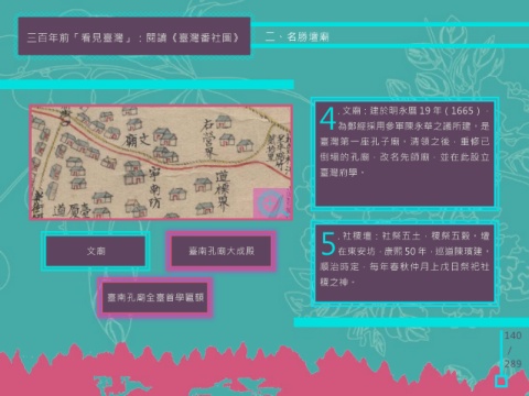 三百年前「看見臺灣」:閱讀《臺灣番社圖》 二、名勝壇廟 . 文廟:建於明永曆 19 年(1665), 4為鄭經採用參軍陳永華之議所建。是 臺灣第一座孔子廟。清領之後,重修已 倒塌的孔廟,改名先師廟,並在此設立 臺灣府學。 . 社稷壇:社祭五土,稷祭五穀。壇 文廟 臺南孔廟大成殿 5在東安坊,康熙 50 年,巡道陳璸建。 順治時定,每年春秋仲月上戊日祭祀社 稷之神。 臺南孔廟全臺首學匾額 140 / 289