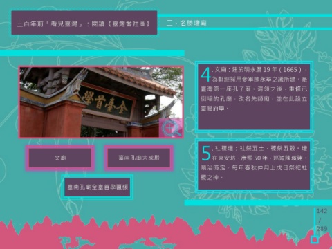 三百年前「看見臺灣」:閱讀《臺灣番社圖》 二、名勝壇廟 . 文廟:建於明永曆 19 年(1665), 4為鄭經採用參軍陳永華之議所建。是 臺灣第一座孔子廟。清領之後,重修已 倒塌的孔廟,改名先師廟,並在此設立 臺灣府學。 . 社稷壇:社祭五土,稷祭五穀。壇 文廟 臺南孔廟大成殿 5在東安坊,康熙 50 年,巡道陳璸建。 順治時定,每年春秋仲月上戊日祭祀社 稷之神。 臺南孔廟全臺首學匾額 142 / 289