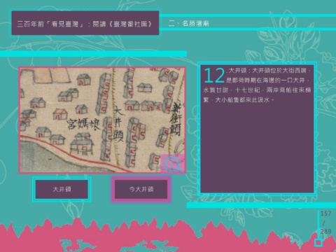 三百年前「看見臺灣」:閱讀《臺灣番社圖》 二、名勝壇廟 . 大井頭:大井頭位於大街西端, 12是鄭荷時期在海邊的一口大井, 水質甘甜,十七世紀,兩岸商船往來頻 繁,大小船隻都來此汲水。 大井頭 今大井頭 157 / 289