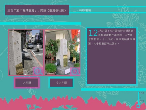 三百年前「看見臺灣」:閱讀《臺灣番社圖》 二、名勝壇廟 . 大井頭:大井頭位於大街西端, 12是鄭荷時期在海邊的一口大井, 水質甘甜,十七世紀,兩岸商船往來頻 繁,大小船隻都來此汲水。 大井頭 今大井頭 158 / 289