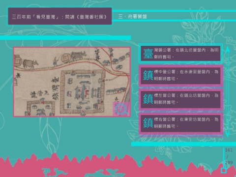 三百年前「看見臺灣」:閱讀《臺灣番社圖》 三、府署營盤 縣 署:在東安坊,為明鄭時建,歷任 官吏均曾修繕。 臺 灣鎮公署:在鎮北坊營盤內,為明 鄭時舊宅。 鎮 標中營公署:在永康里營盤內,為 明鄭時舊宅。 鎮 標左營公署:在鎮北坊營盤內,為 明鄭時舊宅。 鎮 標右營公署:在東安坊營盤內,為 明鄭時舊宅。 臺 灣道公署:臺灣道是臺灣最高行政 161 單位,在西定坊,西向,為明鄭時 舊宅。儀門之外為大門,大門之外為鼓 / 亭和轅門。其址為今永福國小。 289