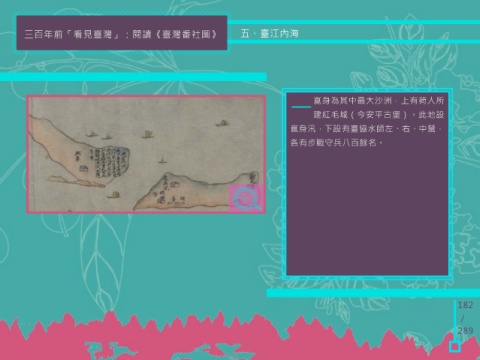 三百年前「看見臺灣」:閱讀《臺灣番社圖》 五、臺江內海 一 崑身為其中最大沙洲,上有荷人所 建紅毛城(今安平古堡)。此地設 崑身汛,下設有臺協水師左、右、中營, 各有步戰守兵八百餘名。 182 / 289
