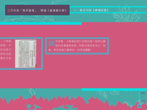 三百年前「看見臺灣」:閱讀《臺灣番社圖》 一、郁永河與《裨海紀遊》 《裨海紀遊》共分三卷,內容大抵如下:上卷說 綜 合來看,《裨海紀遊》記錄的是一趟奇幻冒 明來臺原因及從福州出發一路到臺灣的過程。中 險的浪漫傳奇旅程,同時也是郁永河以「他 卷描述由臺南出發,前往臺北採硫地點的沿路行 者」視角來進行觀察的一段異域體驗。 程與所見所聞。下卷則敘述完成煉硫、取硫及返 回福州的經過,同時概括評論他對臺灣歷史及現 況的觀察。 190 / 289