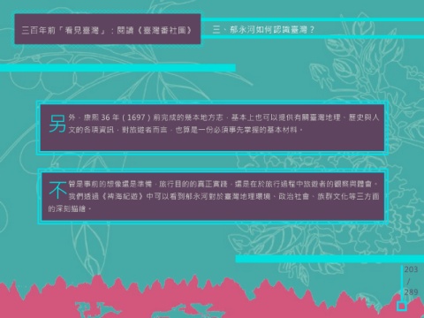 三百年前「看見臺灣」:閱讀《臺灣番社圖》 三、郁永河如何認識臺灣? 另 外,康熙 36 年(1697)前完成的幾本地方志,基本上也可以提供有關臺灣地理、歷史與人 文的各項資訊,對旅遊者而言,也算是一份必須事先掌握的基本材料。 不 管是事前的想像還是準備,旅行目的的真正實踐,還是在於旅行過程中旅遊者的觀察與體會。 我們透過《裨海紀遊》中可以看到郁永河對於臺灣地理環境、政治社會、族群文化等三方面 的深刻描繪。 203 / 289