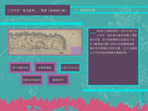 三百年前「看見臺灣」:閱讀《臺灣番社圖》 一、圖像與符號 一 幅現代地圖因具有一定的比例尺及 方向性,因此藉由量測地圖上兩點 間的長度,即可推算實際的距離及方位。 但《臺灣番社圖》因配合長軸圖幅繪製, 僅能呈現概略的相對位置,至於距離則 以文字註記點與點間的概略里程。 現代測量技術 地圖學觀點 比例尺及方向性 相關性與真實性 圖幅有限 21 / 289
