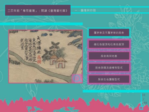 三百年前「看見臺灣」:閱讀《臺灣番社圖》 一、圖像與符號 覆茅草及不覆茅草的房舍 赭石色屋頂和石青色屋頂 房舍高架地基 房舍多間及連棟等型式 房舍左右護龍型式 33 / 289