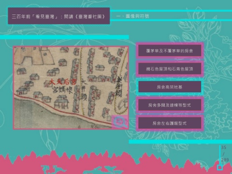 三百年前「看見臺灣」:閱讀《臺灣番社圖》 一、圖像與符號 覆茅草及不覆茅草的房舍 赭石色屋頂和石青色屋頂 房舍高架地基 房舍多間及連棟等型式 房舍左右護龍型式 35 / 289