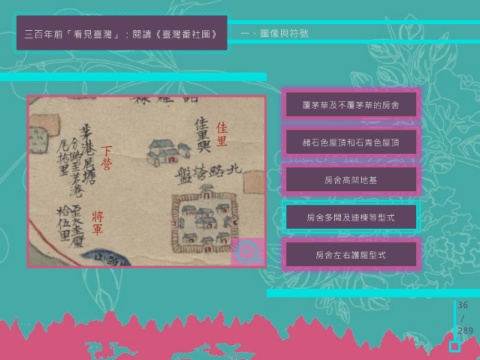 三百年前「看見臺灣」:閱讀《臺灣番社圖》 一、圖像與符號 覆茅草及不覆茅草的房舍 赭石色屋頂和石青色屋頂 房舍高架地基 房舍多間及連棟等型式 房舍左右護龍型式 36 / 289