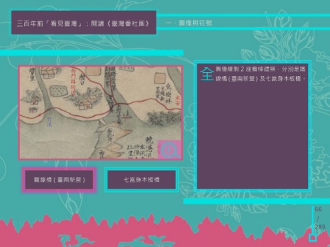 三百年前「看見臺灣」:閱讀《臺灣番社圖》 一、圖像與符號 全 圖僅繪製 2 座橋樑建築,分別是鐵 線橋 ( 臺南新營 ) 及七崑身木板橋。 鐵線橋 ( 臺南新營 ) 七崑身木板橋 66 / 289