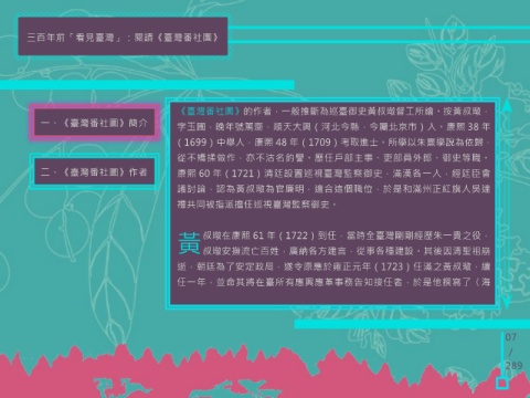 一、《臺灣番社圖》簡介 字玉圃,晚年號篤齋,順天大興(河北今縣,今屬北京市)人。康熙 38 年