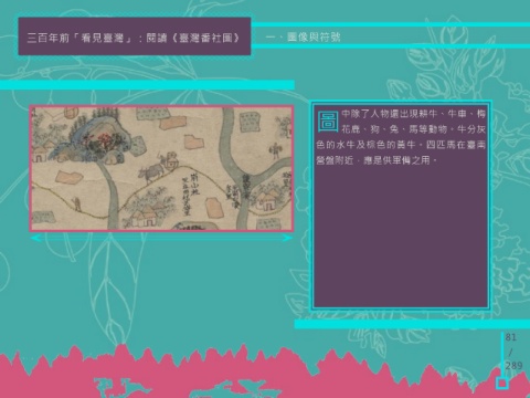 三百年前「看見臺灣」:閱讀《臺灣番社圖》 一、圖像與符號 圖 中除了人物還出現耕牛、牛車、梅 花鹿、狗、兔、馬等動物。牛分灰 色的水牛及棕色的黃牛。四匹馬在臺南 營盤附近,應是供軍備之用。 81 / 289