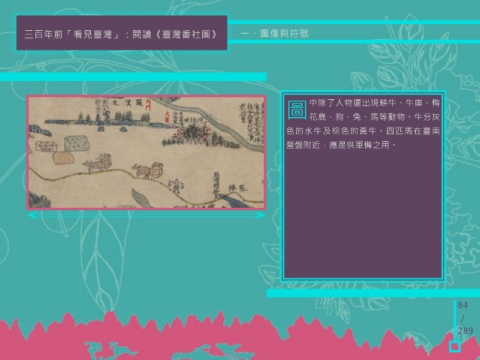 三百年前「看見臺灣」:閱讀《臺灣番社圖》 一、圖像與符號 圖 中除了人物還出現耕牛、牛車、梅 花鹿、狗、兔、馬等動物。牛分灰 色的水牛及棕色的黃牛。四匹馬在臺南 營盤附近,應是供軍備之用。 84 / 289
