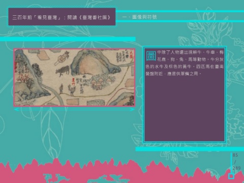 三百年前「看見臺灣」:閱讀《臺灣番社圖》 一、圖像與符號 圖 中除了人物還出現耕牛、牛車、梅 花鹿、狗、兔、馬等動物。牛分灰 色的水牛及棕色的黃牛。四匹馬在臺南 營盤附近,應是供軍備之用。 85 / 289