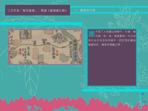 三百年前「看見臺灣」:閱讀《臺灣番社圖》 一、圖像與符號 圖 中除了人物還出現耕牛、牛車、梅 花鹿、狗、兔、馬等動物。牛分灰 色的水牛及棕色的黃牛。四匹馬在臺南 營盤附近,應是供軍備之用。 86 / 289