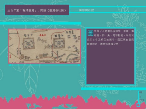 三百年前「看見臺灣」:閱讀《臺灣番社圖》 一、圖像與符號 圖 中除了人物還出現耕牛、牛車、梅 花鹿、狗、兔、馬等動物。牛分灰 色的水牛及棕色的黃牛。四匹馬在臺南 營盤附近,應是供軍備之用。 88 / 289