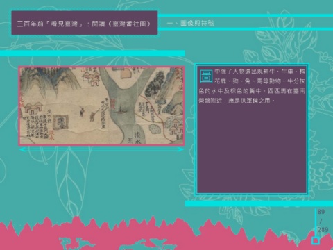 三百年前「看見臺灣」:閱讀《臺灣番社圖》 一、圖像與符號 圖 中除了人物還出現耕牛、牛車、梅 花鹿、狗、兔、馬等動物。牛分灰 色的水牛及棕色的黃牛。四匹馬在臺南 營盤附近,應是供軍備之用。 89 / 289