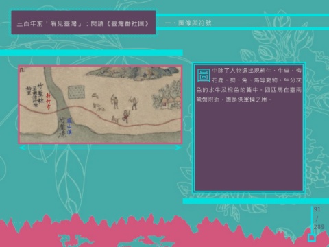 三百年前「看見臺灣」:閱讀《臺灣番社圖》 一、圖像與符號 圖 中除了人物還出現耕牛、牛車、梅 花鹿、狗、兔、馬等動物。牛分灰 色的水牛及棕色的黃牛。四匹馬在臺南 營盤附近,應是供軍備之用。 91 / 289