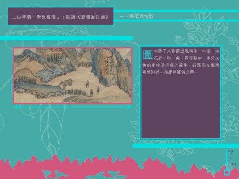 三百年前「看見臺灣」:閱讀《臺灣番社圖》 一、圖像與符號 圖 中除了人物還出現耕牛、牛車、梅 花鹿、狗、兔、馬等動物。牛分灰 色的水牛及棕色的黃牛。四匹馬在臺南 營盤附近,應是供軍備之用。 92 / 289