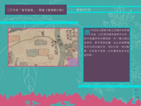 三百年前「看見臺灣」:閱讀《臺灣番社圖》 一、圖像與符號 圖 中田地以墨線勾勒出四邊形或多邊 形後,以石青色塗佈者表示水田, 田中加繪併排的兩短線。另一種以赭石 色塗佈,表示旱田或園。由北至南兩種 田地均有交錯分布,有的分散、有的毗 鄰,形狀各不相同。此外還有些空地註 記荒埔。 94 / 289